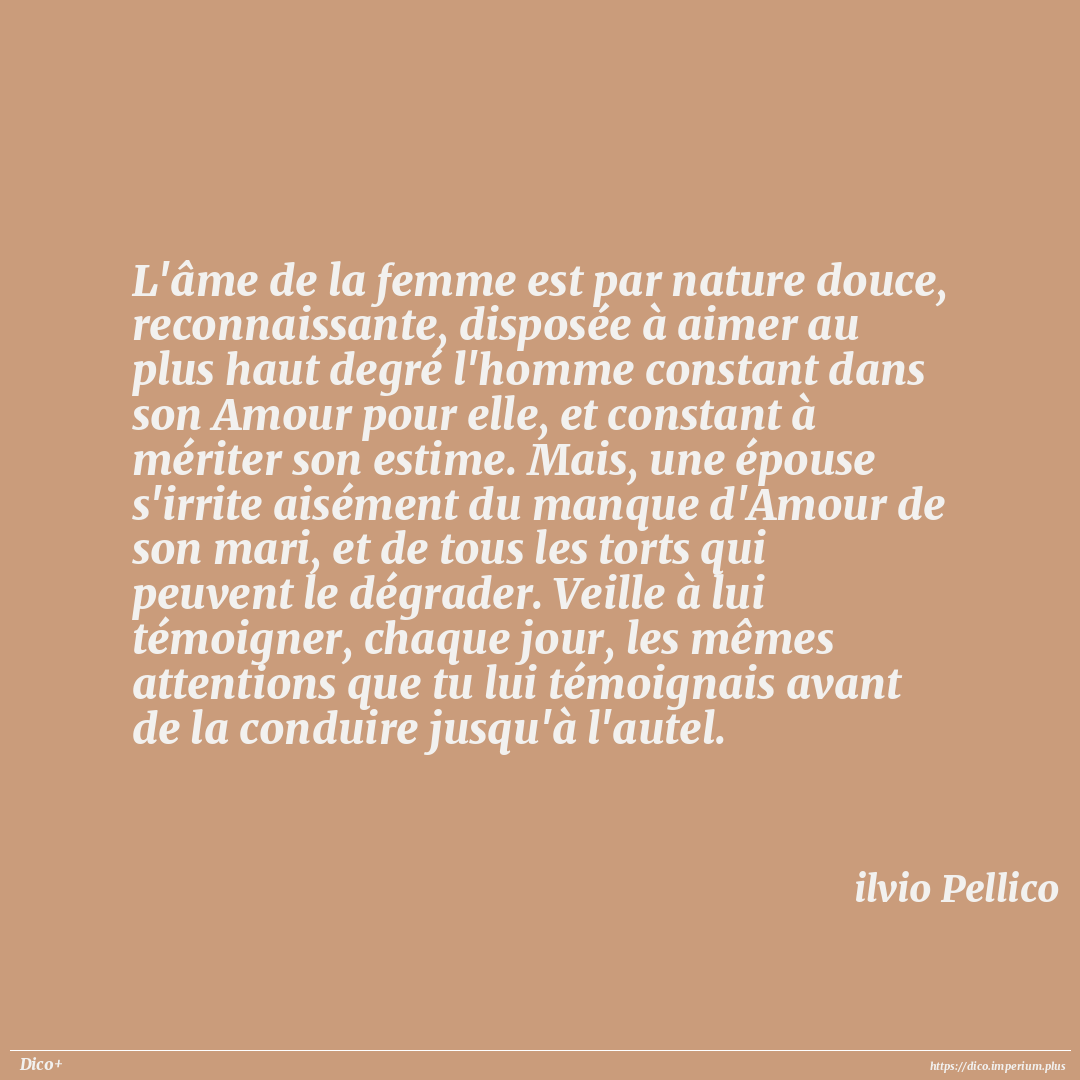 L'âme de la femme est par nature douce, reconnaissante, disposée à aimer au plus haut degré l'homme constant dans son Amour pour elle, et constant à mériter son estime. Mais, une épouse s'irrite aisément du manque d'Amour de son mari, et de tous les torts qui peuvent le dégrader. Veille à lui témoigner, chaque jour, les mêmes attentions que tu lui témoignais avant de la conduire jusqu'à l'autel.