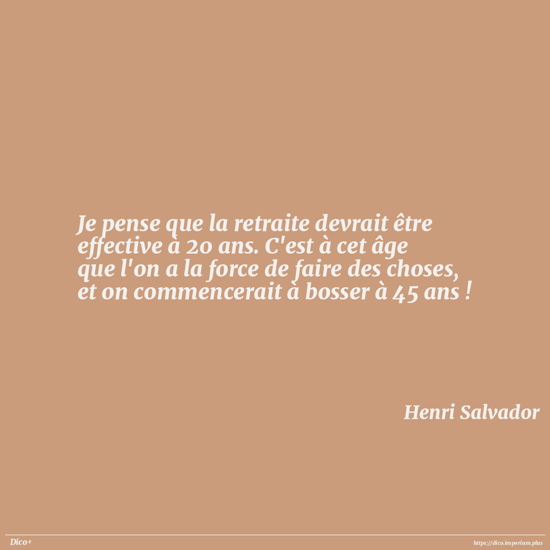 Je pense que la retraite devrait être effective à 20 ans. C'est à cet âge que l'on a la force de faire des choses, et on commencerait à bosser à 45 ans !