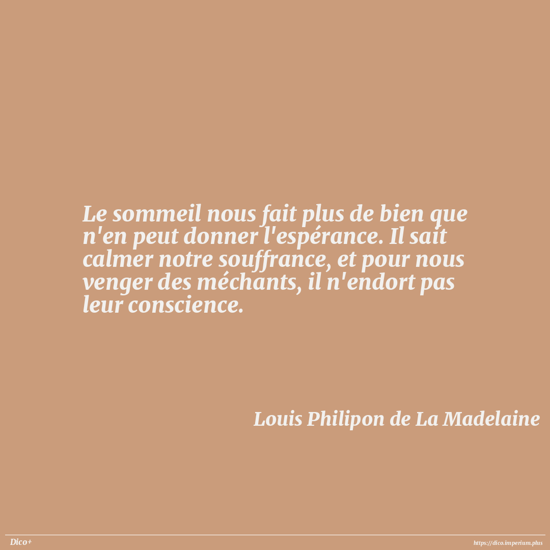 Le sommeil nous fait plus de bien que n'en peut donner l'espérance. Il sait calmer notre souffrance, et pour nous venger des méchants, il n'endort pas leur conscience.