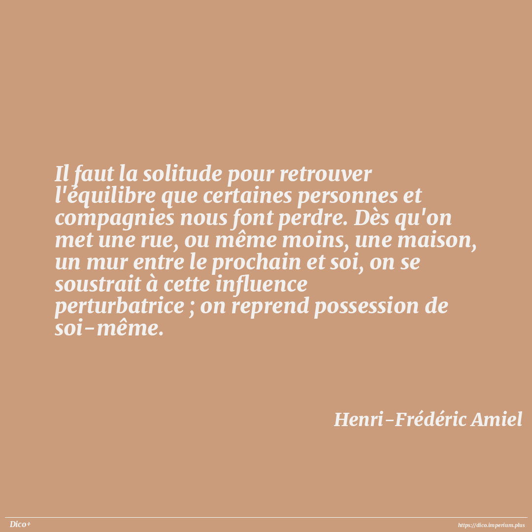 Il faut la solitude pour retrouver l'équilibre que certaines personnes et compagnies nous font perdre. Dès qu'on met une rue, ou même moins, une maison, un mur entre le prochain et soi, on se soustrait à cette influence perturbatrice ; on reprend possession de soi-même.