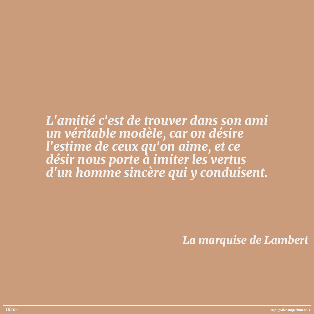 L'amitié c'est de trouver dans son ami un véritable modèle, car on désire l'estime de ceux qu'on aime, et ce désir nous porte à imiter les vertus d'un homme sincère qui y conduisent.