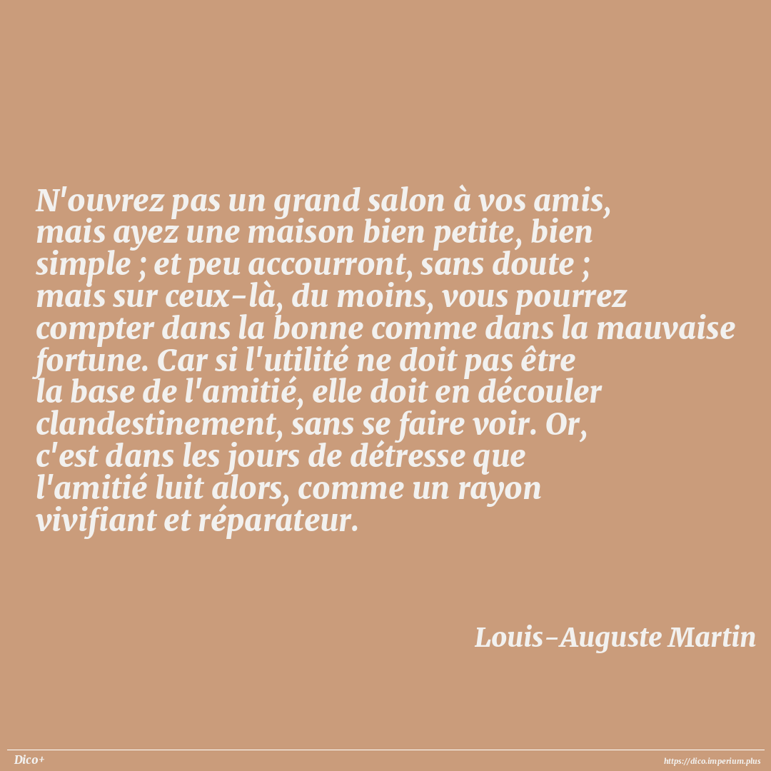 N'ouvrez pas un grand salon à vos amis, mais ayez une maison bien petite, bien simple ; et peu accourront, sans doute ; mais sur ceux-là, du moins, vous pourrez compter dans la bonne comme dans la mauvaise fortune. Car si l'utilité ne doit pas être la base de l'amitié, elle doit en découler clandestinement, sans se faire voir. Or, c'est dans les jours de détresse que l'amitié luit alors, comme un rayon vivifiant et réparateur.