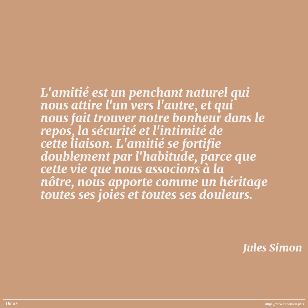 L'amitié est un penchant naturel qui nous attire l'un vers l'autre, et qui nous fait trouver notre bonheur dans le repos, la sécurité et l'intimité de cette liaison. L'amitié se fortifie doublement par l'habitude, parce que cette vie que nous associons à la nôtre, nous apporte comme un héritage toutes ses joies et toutes ses douleurs.