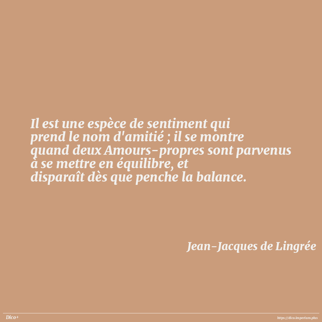 Il est une espèce de sentiment qui prend le nom d'amitié ; il se montre quand deux Amours-propres sont parvenus à se mettre en équilibre, et disparaît dès que penche la balance.