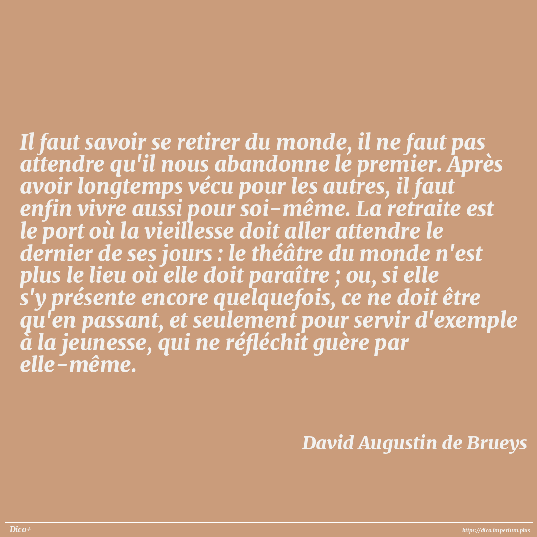 Il faut savoir se retirer du monde, il ne faut pas attendre qu'il nous abandonne le premier. Après avoir longtemps vécu pour les autres, il faut enfin vivre aussi pour soi-même. La retraite est le port où la vieillesse doit aller attendre le dernier de ses jours : le théâtre du monde n'est plus le lieu où elle doit paraître ; ou, si elle s'y présente encore quelquefois, ce ne doit être qu'en passant, et seulement pour servir d'exemple à la jeunesse, qui ne réfléchit guère par elle-même.