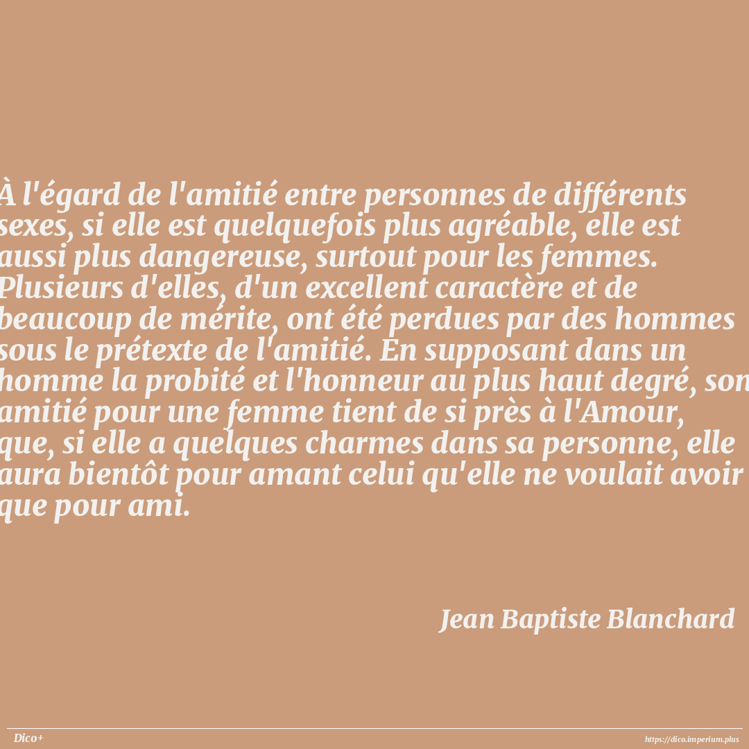 À l'égard de l'amitié entre personnes de différents sexes, si elle est quelquefois plus agréable, elle est aussi plus dangereuse, surtout pour les femmes. Plusieurs d'elles, d'un excellent caractère et de beaucoup de mérite, ont été perdues par des hommes sous le prétexte de l'amitié. En supposant dans un homme la probité et l'honneur au plus haut degré, son amitié pour une femme tient de si près à l'Amour, que, si elle a quelques charmes dans sa personne, elle aura bientôt pour amant celui qu'elle ne voulait avoir que pour ami.