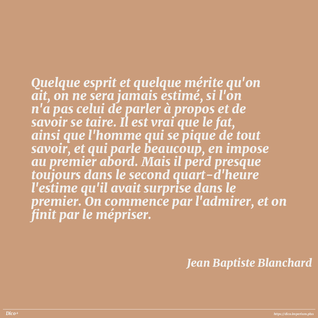 Quelque esprit et quelque mérite qu'on ait, on ne sera jamais estimé, si l'on n'a pas celui de parler à propos et de savoir se taire. Il est vrai que le fat, ainsi que l'homme qui se pique de tout savoir, et qui parle beaucoup, en impose au premier abord. Mais il perd presque toujours dans le second quart-d'heure l'estime qu'il avait surprise dans le premier. On commence par l'admirer, et on finit par le mépriser.