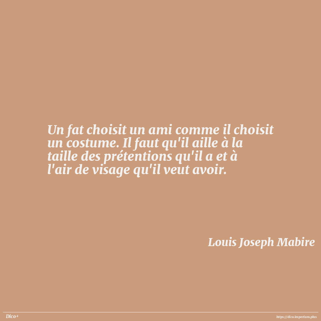 Un fat choisit un ami comme il choisit un costume. Il faut qu'il aille à la taille des prétentions qu'il a et à l'air de visage qu'il veut avoir.