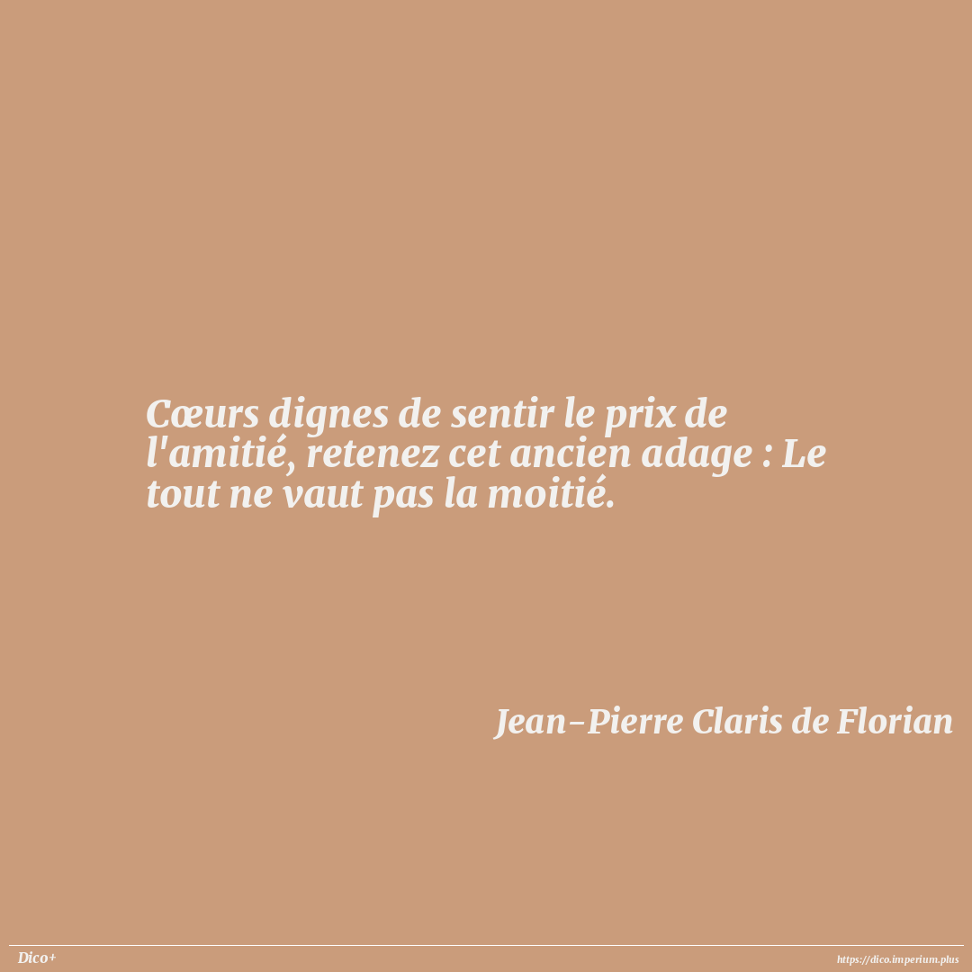 Cœurs dignes de sentir le prix de l'amitié, retenez cet ancien adage : Le tout ne vaut pas la moitié.