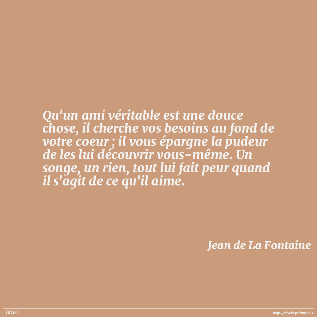 Qu'un ami véritable est une douce chose, il cherche vos besoins au fond de votre coeur ; il vous épargne la pudeur de les lui découvrir vous-même. Un songe, un rien, tout lui fait peur quand il s'agit de ce qu'il aime.