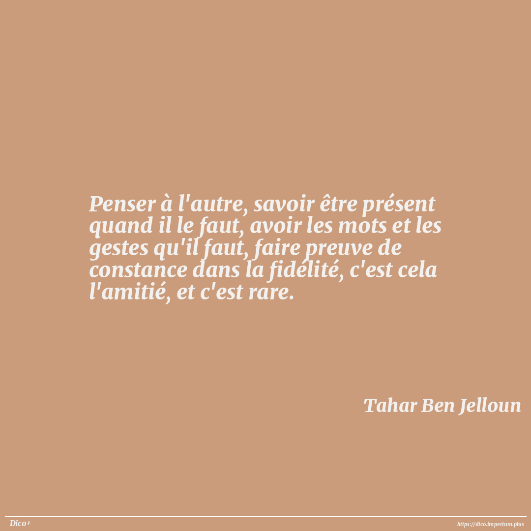 Penser à l'autre, savoir être présent quand il le faut, avoir les mots et les gestes qu'il faut, faire preuve de constance dans la fidélité, c'est cela l'amitié, et c'est rare.