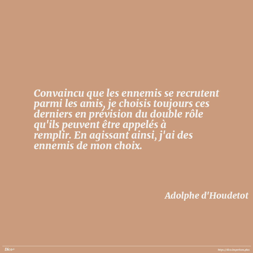 Convaincu que les ennemis se recrutent parmi les amis, je choisis toujours ces derniers en prévision du double rôle qu'ils peuvent être appelés à remplir. En agissant ainsi, j'ai des ennemis de mon choix.