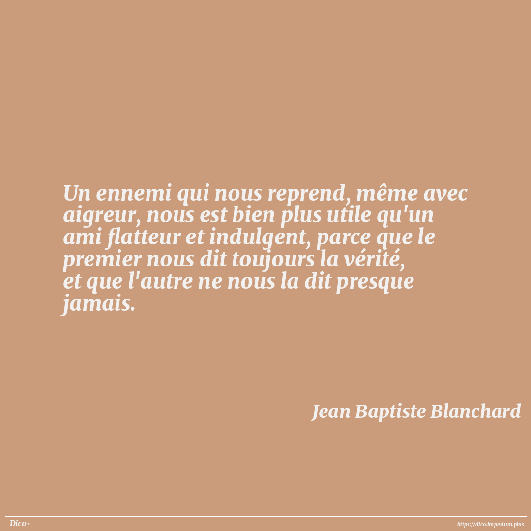 Un ennemi qui nous reprend, même avec aigreur, nous est bien plus utile qu'un ami flatteur et indulgent, parce que le premier nous dit toujours la vérité, et que l'autre ne nous la dit presque jamais.
