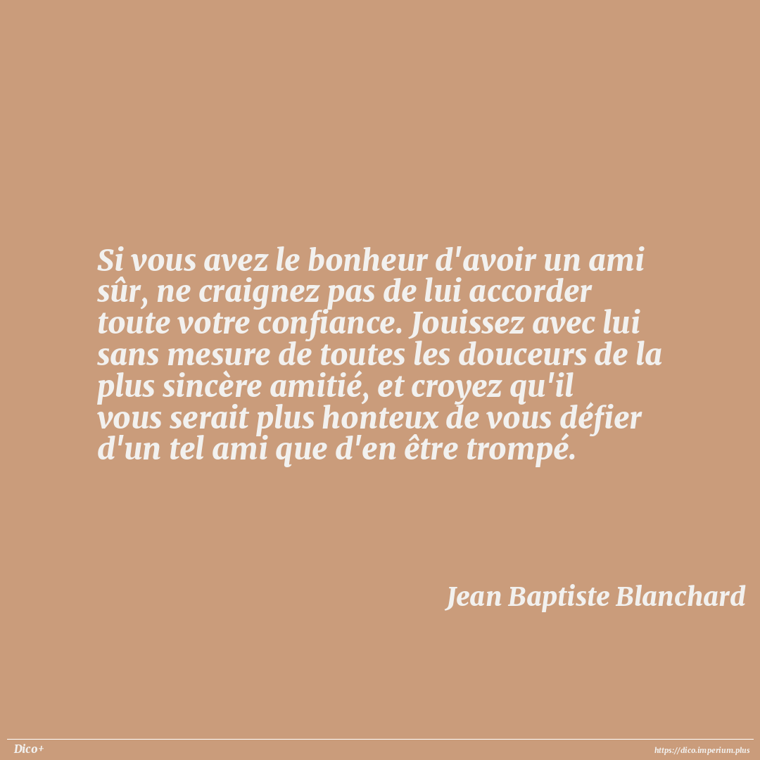 Si vous avez le bonheur d'avoir un ami sûr, ne craignez pas de lui accorder toute votre confiance. Jouissez avec lui sans mesure de toutes les douceurs de la plus sincère amitié, et croyez qu'il vous serait plus honteux de vous défier d'un tel ami que d'en être trompé.