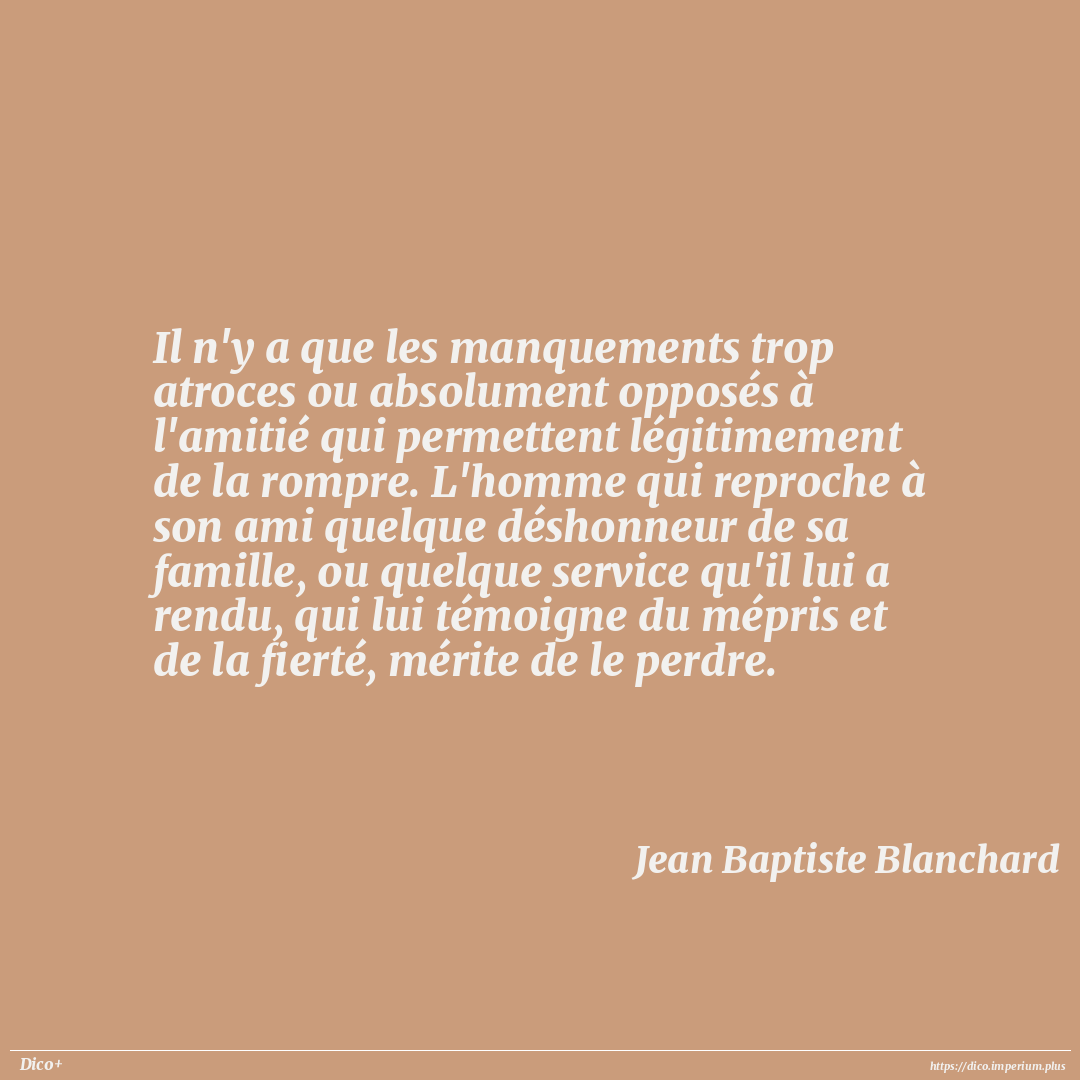 Il n'y a que les manquements trop atroces ou absolument opposés à l'amitié qui permettent légitimement de la rompre. L'homme qui reproche à son ami quelque déshonneur de sa famille, ou quelque service qu'il lui a rendu, qui lui témoigne du mépris et de la fierté, mérite de le perdre.