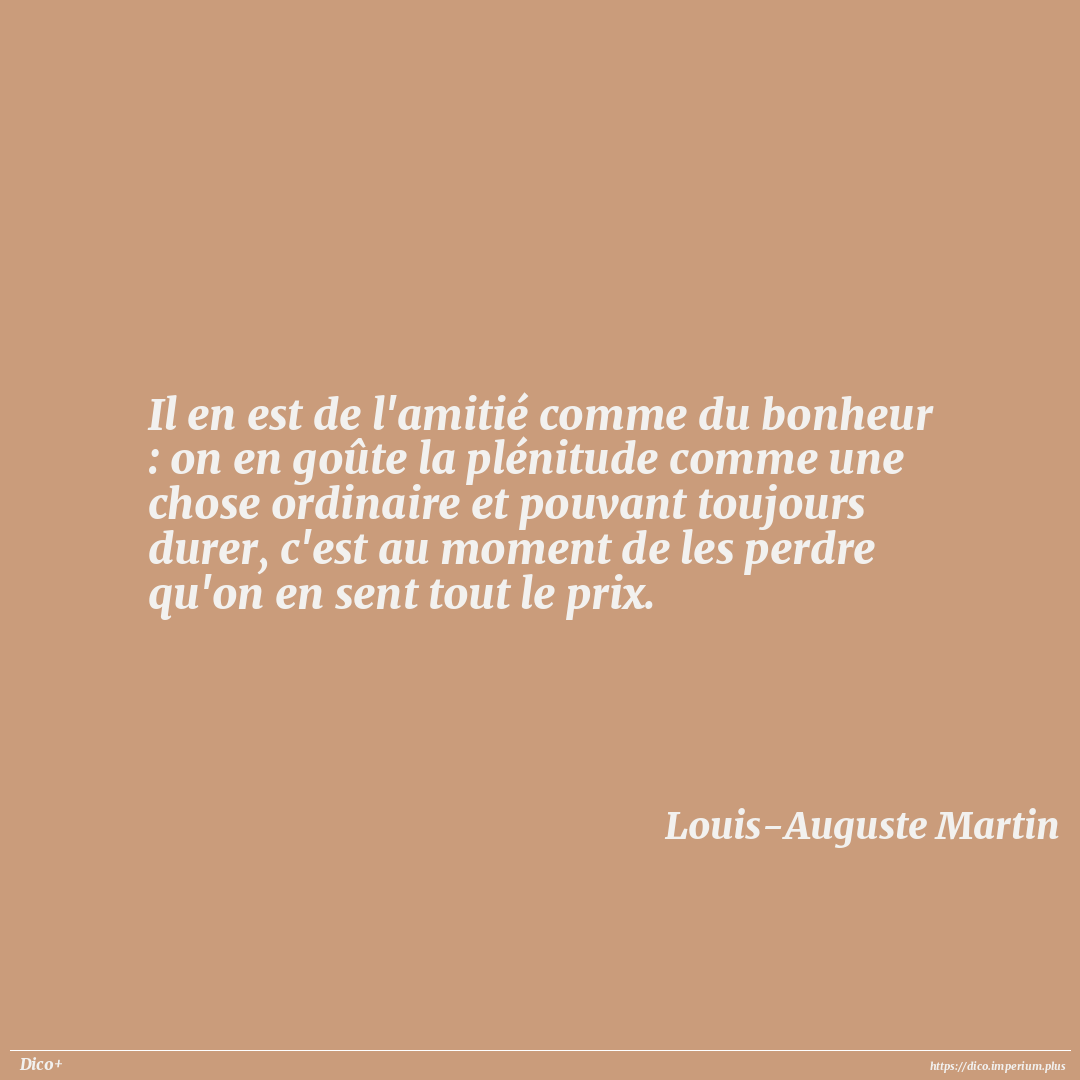 Il en est de l'amitié comme du bonheur : on en goûte la plénitude comme une chose ordinaire et pouvant toujours durer, c'est au moment de les perdre qu'on en sent tout le prix.