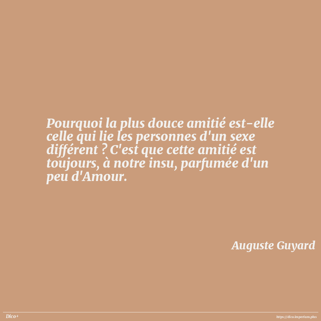 Pourquoi la plus douce amitié est-elle celle qui lie les personnes d'un sexe différent ? C'est que cette amitié est toujours, à notre insu, parfumée d'un peu d'Amour.