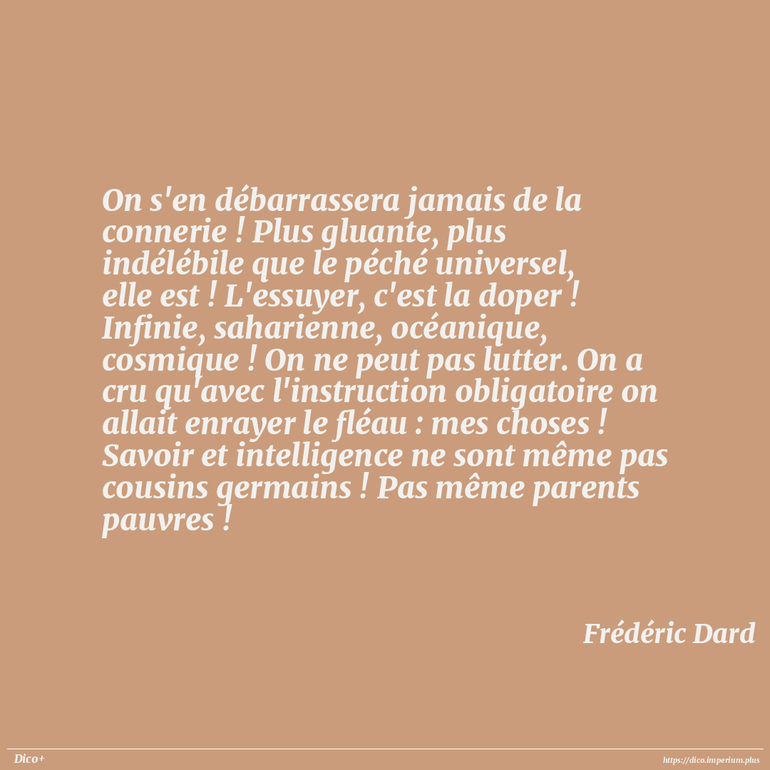 On s'en débarrassera jamais de la connerie ! Plus gluante, plus indélébile que le péché universel, elle est ! L'essuyer, c'est la doper ! Infinie, saharienne, océanique, cosmique ! On ne peut pas lutter. On a cru qu'avec l'instruction obligatoire on allait enrayer le fléau : mes choses ! Savoir et intelligence ne sont même pas cousins germains ! Pas même parents pauvres !