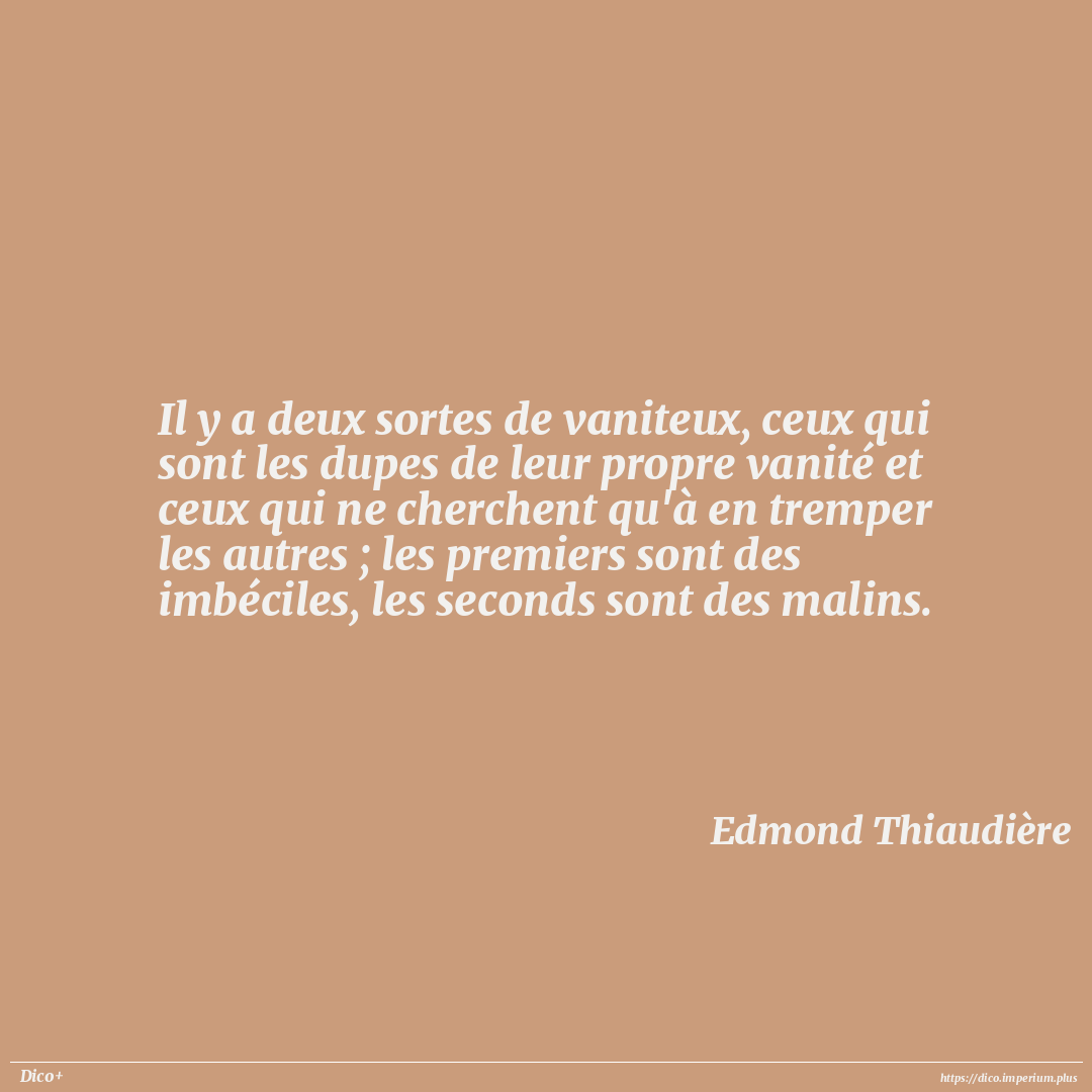 Il y a deux sortes de vaniteux, ceux qui sont les dupes de leur propre vanité et ceux qui ne cherchent qu'à en tremper les autres ; les premiers sont des imbéciles, les seconds sont des malins.