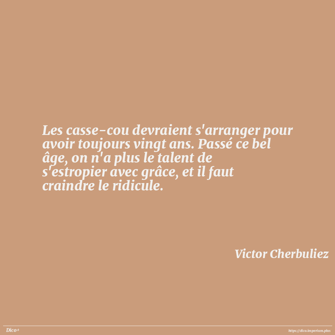 Les casse-cou devraient s'arranger pour avoir toujours vingt ans. Passé ce bel âge, on n'a plus le talent de s'estropier avec grâce, et il faut craindre le ridicule.