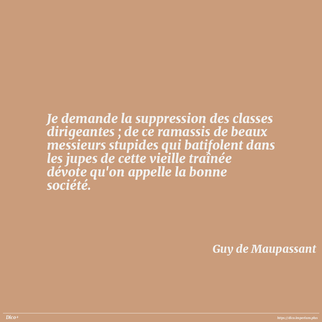 Je demande la suppression des classes dirigeantes ; de ce ramassis de beaux messieurs stupides qui batifolent dans les jupes de cette vieille traînée dévote qu'on appelle la bonne société.