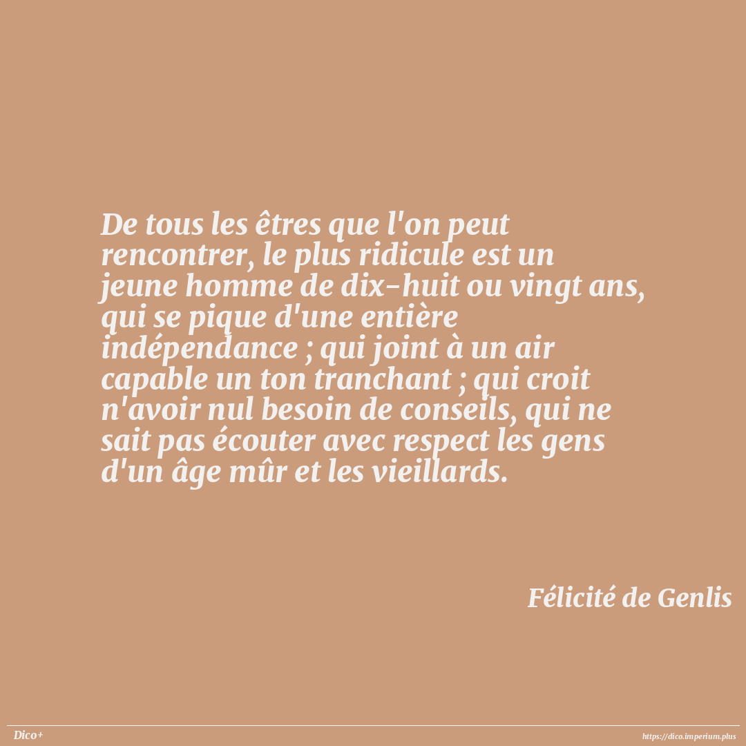 De tous les êtres que l'on peut rencontrer, le plus ridicule est un jeune homme de dix-huit ou vingt ans, qui se pique d'une entière indépendance ; qui joint à un air capable un ton tranchant ; qui croit n'avoir nul besoin de conseils, qui ne sait pas écouter avec respect les gens d'un âge mûr et les vieillards.
