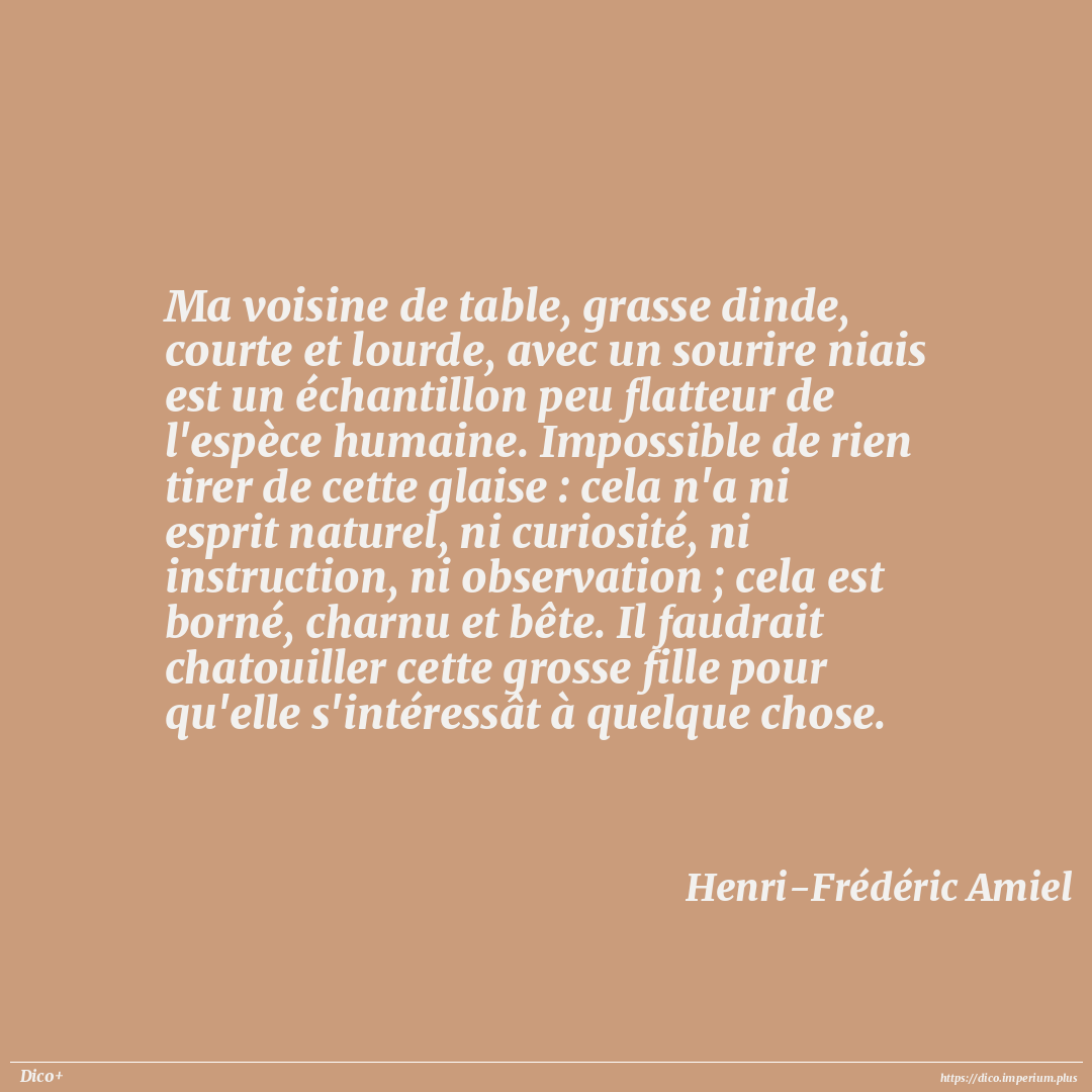 Ma voisine de table, grasse dinde, courte et lourde, avec un sourire niais est un échantillon peu flatteur de l'espèce humaine. Impossible de rien tirer de cette glaise : cela n'a ni esprit naturel, ni curiosité, ni instruction, ni observation ; cela est borné, charnu et bête. Il faudrait chatouiller cette grosse fille pour qu'elle s'intéressât à quelque chose.