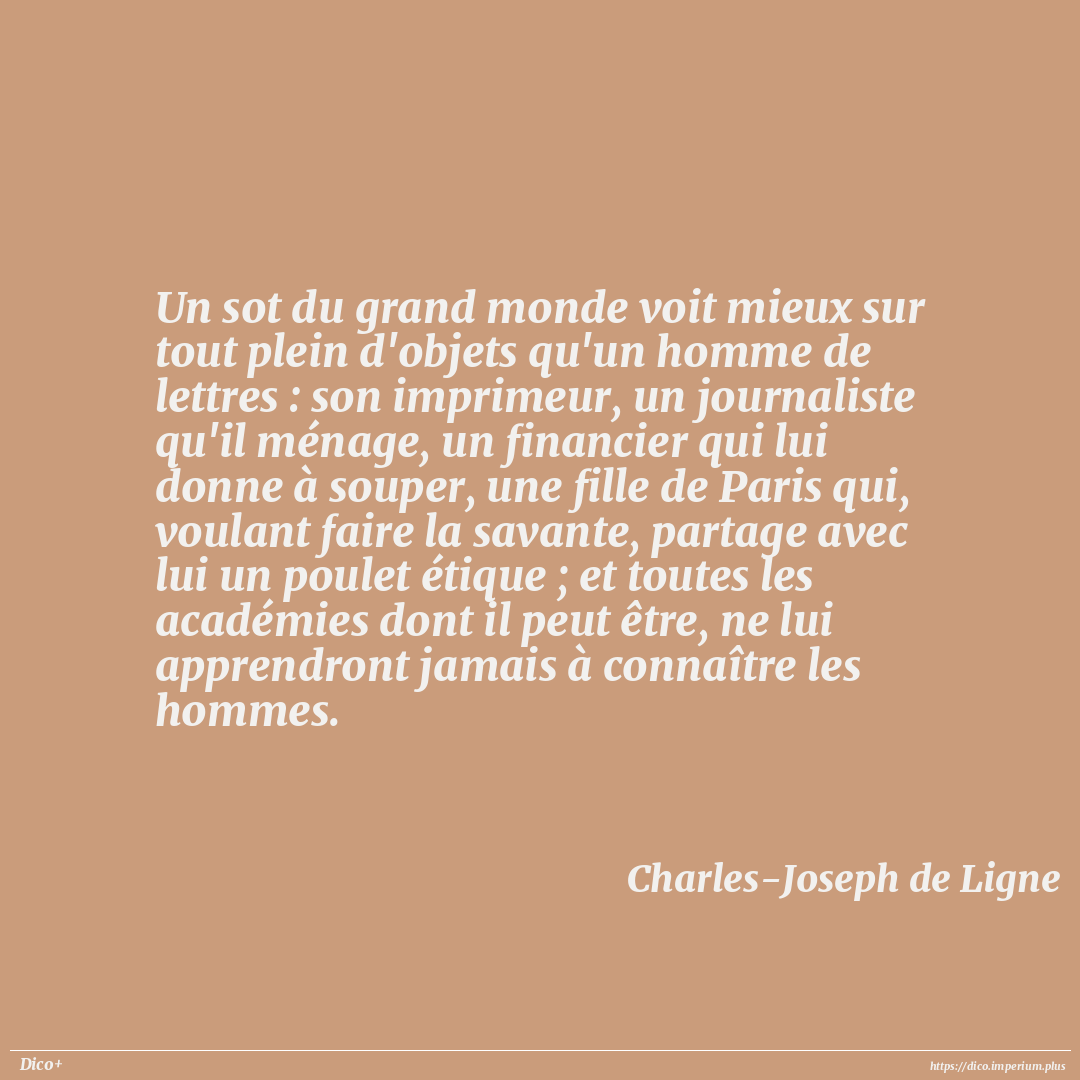 Un sot du grand monde voit mieux sur tout plein d'objets qu'un homme de lettres : son imprimeur, un journaliste qu'il ménage, un financier qui lui donne à souper, une fille de Paris qui, voulant faire la savante, partage avec lui un poulet étique ; et toutes les académies dont il peut être, ne lui apprendront jamais à connaître les hommes.