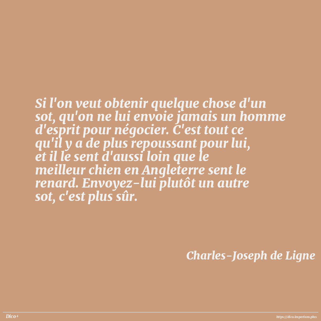 Si l'on veut obtenir quelque chose d'un sot, qu'on ne lui envoie jamais un homme d'esprit pour négocier. C'est tout ce qu'il y a de plus repoussant pour lui, et il le sent d'aussi loin que le meilleur chien en Angleterre sent le renard. Envoyez-lui plutôt un autre sot, c'est plus sûr.