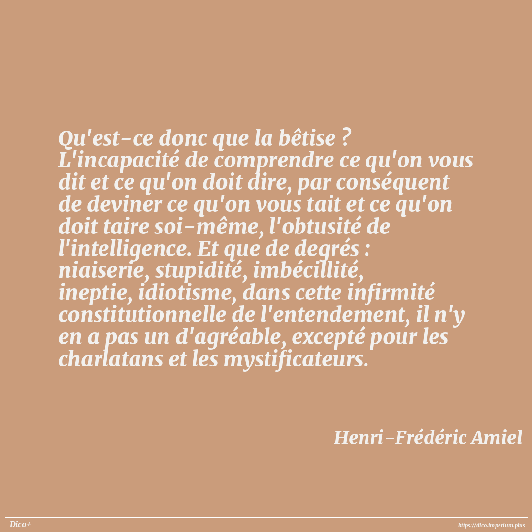 Qu'est-ce donc que la bêtise ? L'incapacité de comprendre ce qu'on vous dit et ce qu'on doit dire, par conséquent de deviner ce qu'on vous tait et ce qu'on doit taire soi-même, l'obtusité de l'intelligence. Et que de degrés : niaiserie, stupidité, imbécillité, ineptie, idiotisme, dans cette infirmité constitutionnelle de l'entendement, il n'y en a pas un d'agréable, excepté pour les charlatans et les mystificateurs.