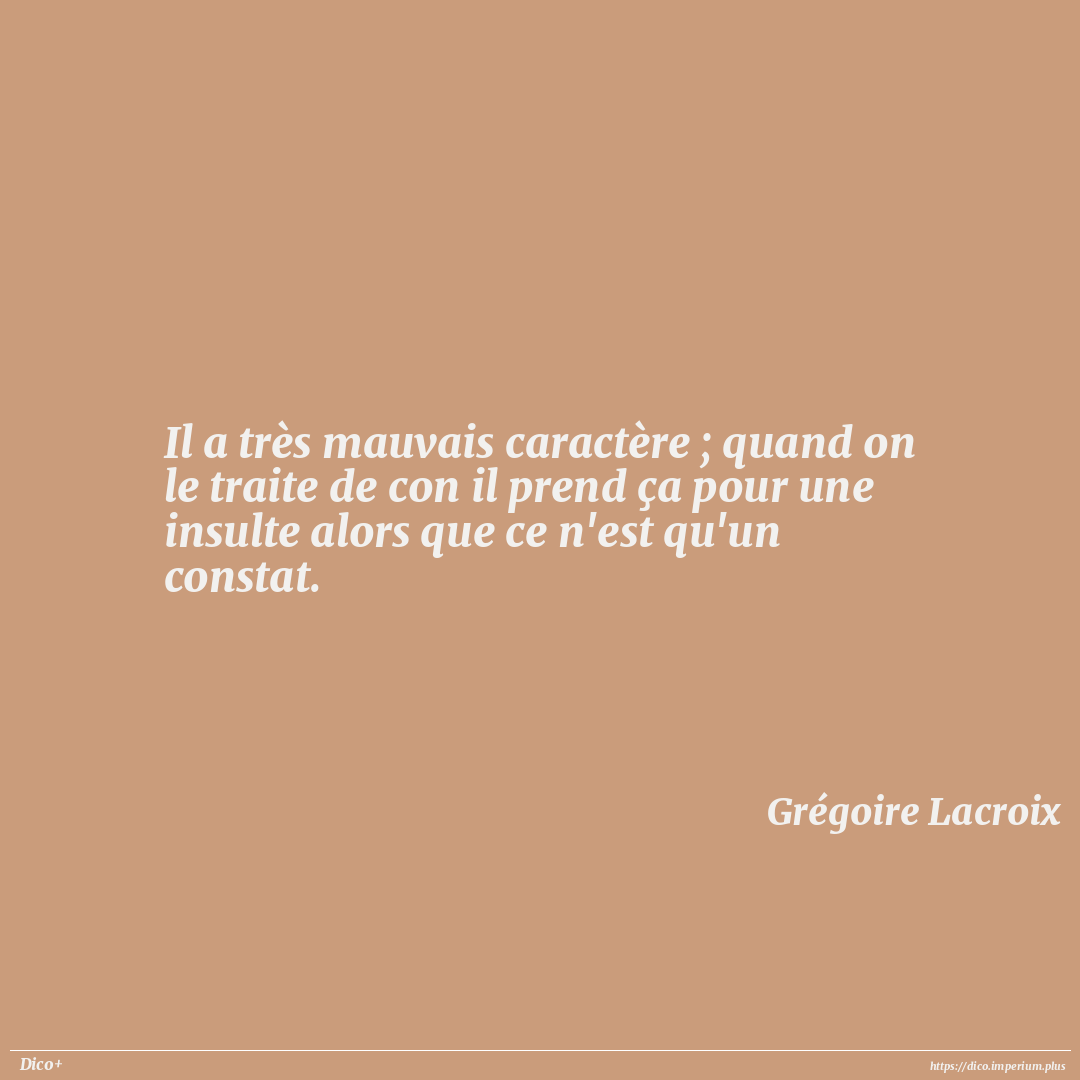 Il a très mauvais caractère ; quand on le traite de con il prend ça pour une insulte alors que ce n'est qu'un constat.