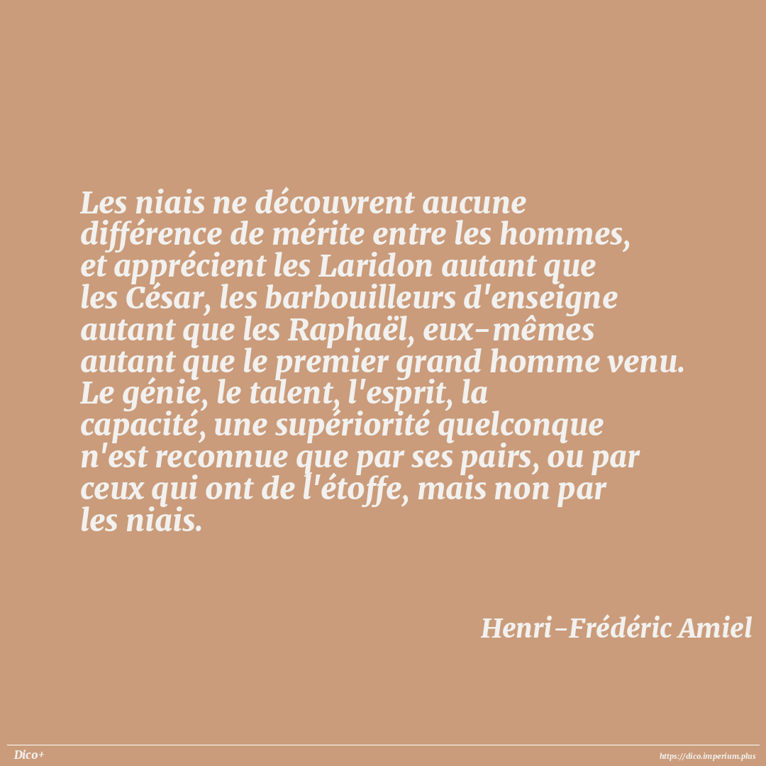 Les niais ne découvrent aucune différence de mérite entre les hommes, et apprécient les Laridon autant que les César, les barbouilleurs d'enseigne autant que les Raphaël, eux-mêmes autant que le premier grand homme venu. Le génie, le talent, l'esprit, la capacité, une supériorité quelconque n'est reconnue que par ses pairs, ou par ceux qui ont de l'étoffe, mais non par les niais.