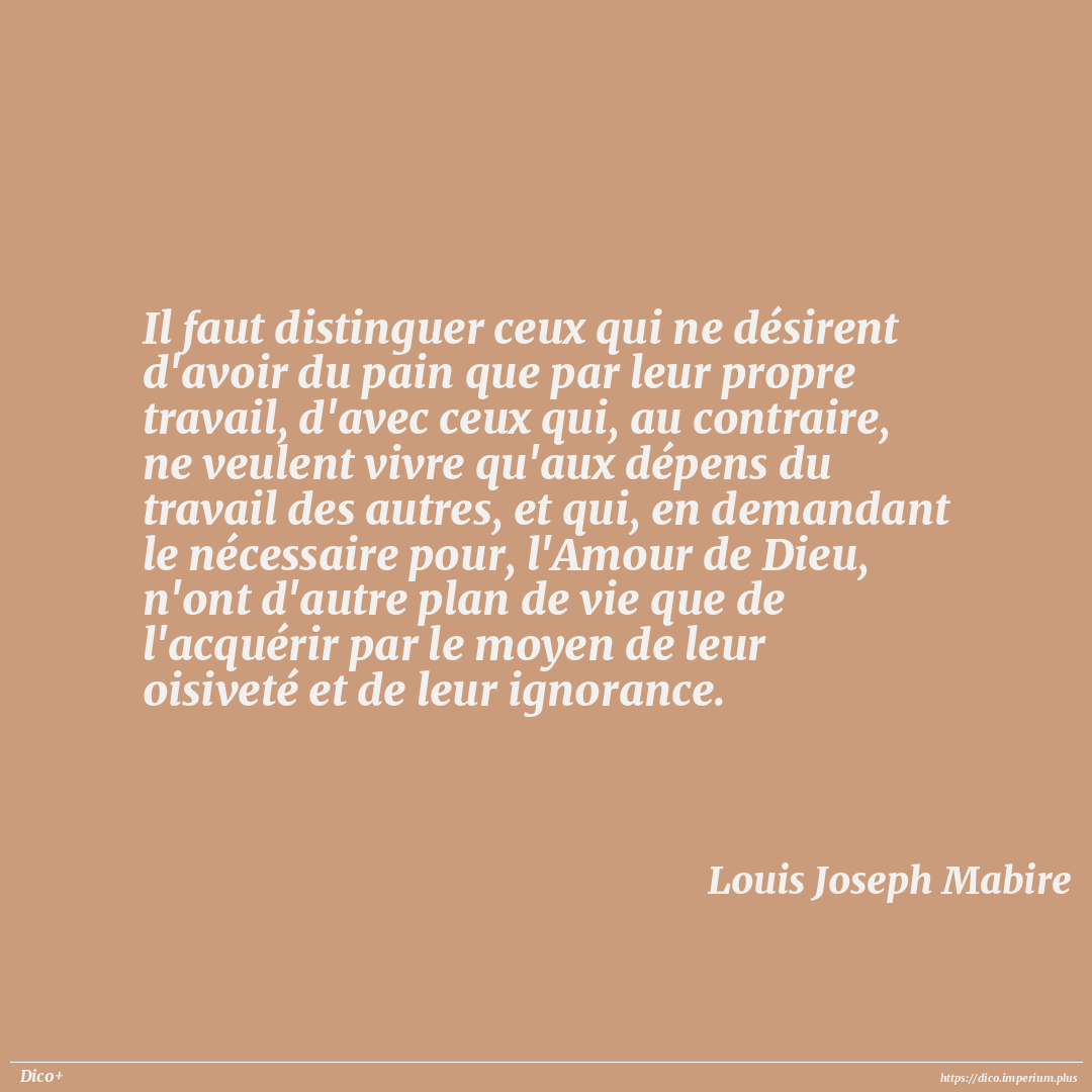Il faut distinguer ceux qui ne désirent d'avoir du pain que par leur propre travail, d'avec ceux qui, au contraire, ne veulent vivre qu'aux dépens du travail des autres, et qui, en demandant le nécessaire pour, l'Amour de Dieu, n'ont d'autre plan de vie que de l'acquérir par le moyen de leur oisiveté et de leur ignorance.
