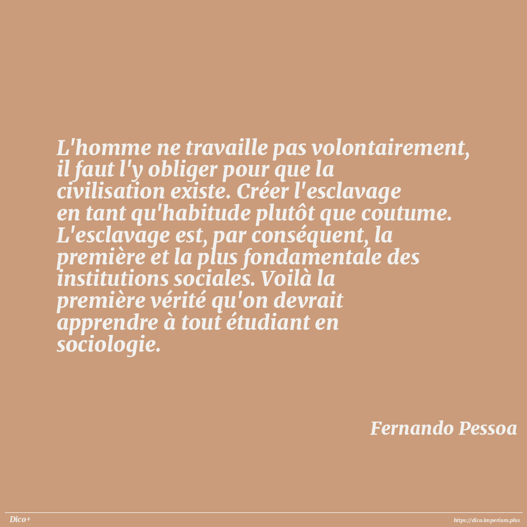 L'homme ne travaille pas volontairement, il faut l'y obliger pour que la civilisation existe. Créer l'esclavage en tant qu'habitude plutôt que coutume. L'esclavage est, par conséquent, la première et la plus fondamentale des institutions sociales. Voilà la première vérité qu'on devrait apprendre à tout étudiant en sociologie.