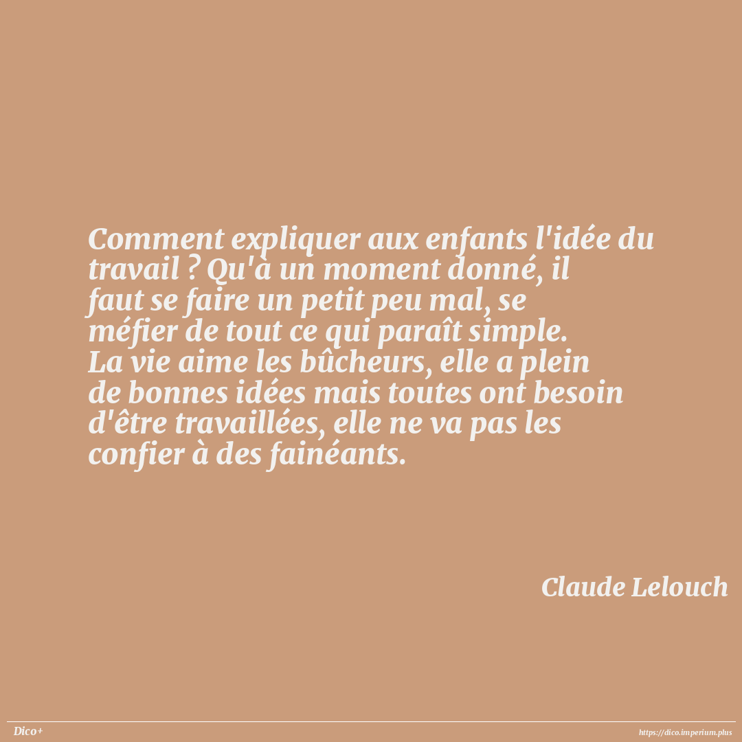 Comment expliquer aux enfants l'idée du travail ? Qu'à un moment donné, il faut se faire un petit peu mal, se méfier de tout ce qui paraît simple. La vie aime les bûcheurs, elle a plein de bonnes idées mais toutes ont besoin d'être travaillées, elle ne va pas les confier à des fainéants.