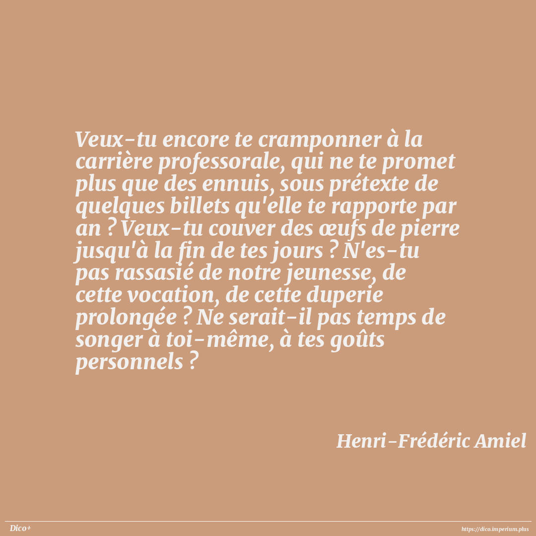 Veux-tu encore te cramponner à la carrière professorale, qui ne te promet plus que des ennuis, sous prétexte de quelques billets qu'elle te rapporte par an ? Veux-tu couver des œufs de pierre jusqu'à la fin de tes jours ? N'es-tu pas rassasié de notre jeunesse, de cette vocation, de cette duperie prolongée ? Ne serait-il pas temps de songer à toi-même, à tes goûts personnels ?