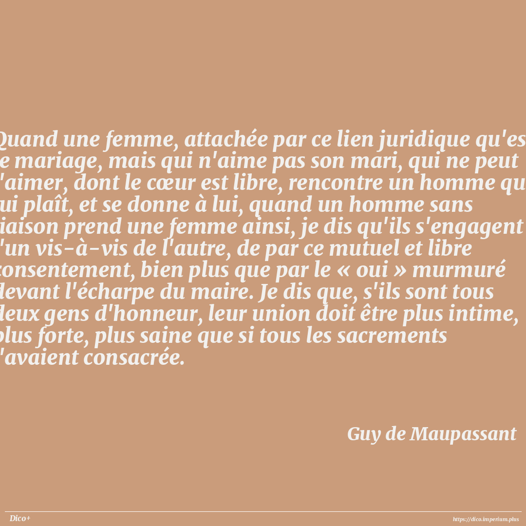 Quand une femme, attachée par ce lien juridique qu'est le mariage, mais qui n'aime pas son mari, qui ne peut l'aimer, dont le cœur est libre, rencontre un homme qui lui plaît, et se donne à lui, quand un homme sans liaison prend une femme ainsi, je dis qu'ils s'engagent l'un vis-à-vis de l'autre, de par ce mutuel et libre consentement, bien plus que par le « oui » murmuré devant l'écharpe du maire. Je dis que, s'ils sont tous deux gens d'honneur, leur union doit être plus intime, plus forte, plus saine que si tous les sacrements l'avaient consacrée.