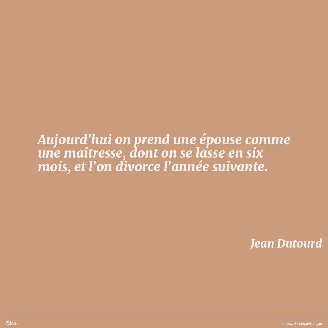 Aujourd'hui on prend une épouse comme une maîtresse, dont on se lasse en six mois, et l'on divorce l'année suivante.