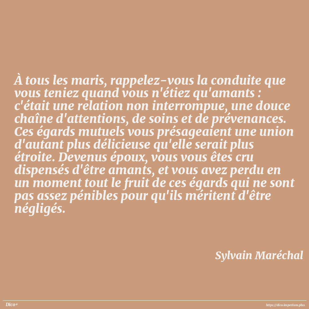 À tous les maris, rappelez-vous la conduite que vous teniez quand vous n'étiez qu'amants : c'était une relation non interrompue, une douce chaîne d'attentions, de soins et de prévenances. Ces égards mutuels vous présageaient une union d'autant plus délicieuse qu'elle serait plus étroite. Devenus époux, vous vous êtes cru dispensés d'être amants, et vous avez perdu en un moment tout le fruit de ces égards qui ne sont pas assez pénibles pour qu'ils méritent d'être négligés.