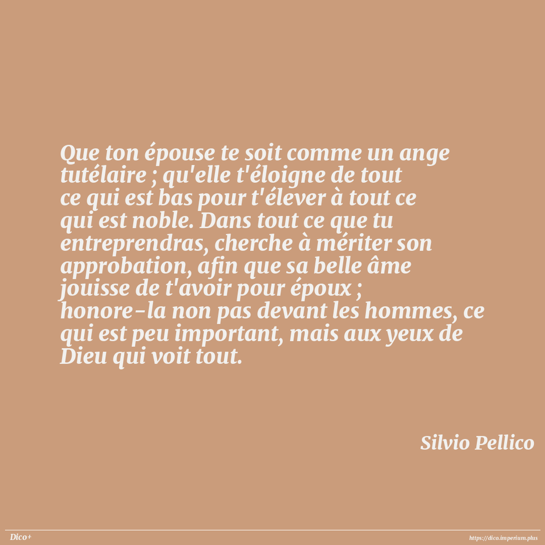 Que ton épouse te soit comme un ange tutélaire ; qu'elle t'éloigne de tout ce qui est bas pour t'élever à tout ce qui est noble. Dans tout ce que tu entreprendras, cherche à mériter son approbation, afin que sa belle âme jouisse de t'avoir pour époux ; honore-la non pas devant les hommes, ce qui est peu important, mais aux yeux de Dieu qui voit tout.