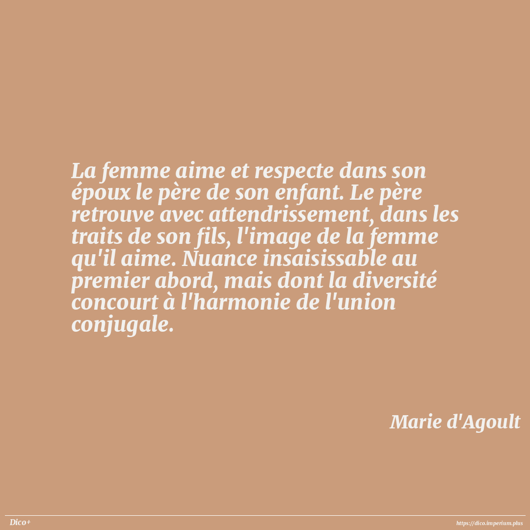 La femme aime et respecte dans son époux le père de son enfant. Le père retrouve avec attendrissement, dans les traits de son fils, l'image de la femme qu'il aime. Nuance insaisissable au premier abord, mais dont la diversité concourt à l'harmonie de l'union conjugale.