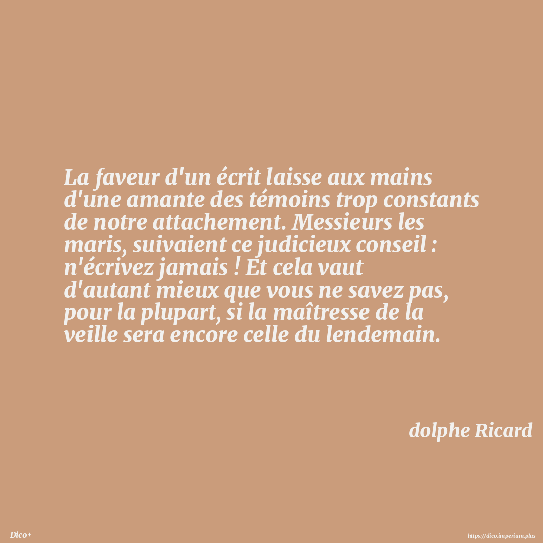 La faveur d'un écrit laisse aux mains d'une amante des témoins trop constants de notre attachement. Messieurs les maris, suivaient ce judicieux conseil : n'écrivez jamais ! Et cela vaut d'autant mieux que vous ne savez pas, pour la plupart, si la maîtresse de la veille sera encore celle du lendemain.
