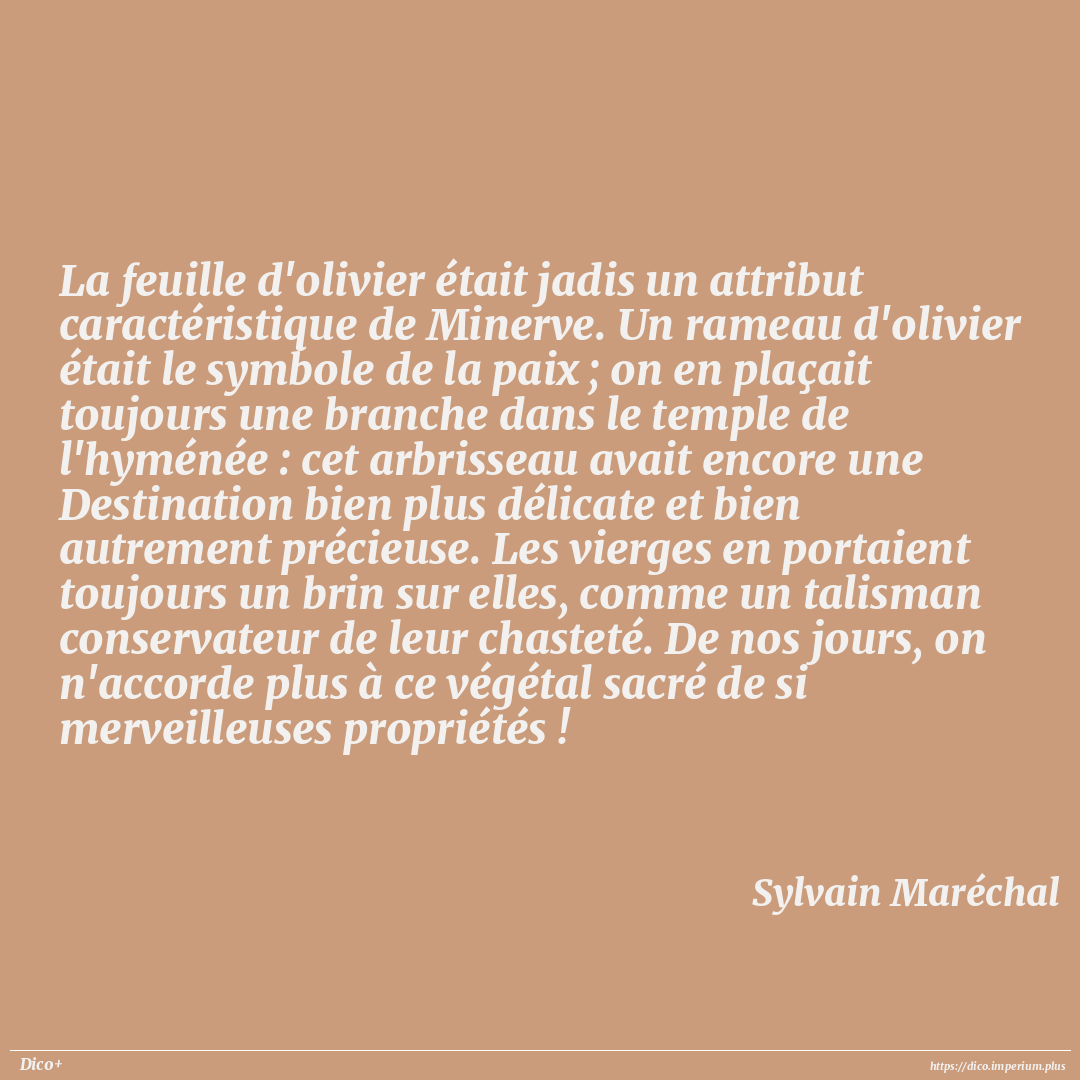 La feuille d'olivier était jadis un attribut caractéristique de Minerve. Un rameau d'olivier était le symbole de la paix ; on en plaçait toujours une branche dans le temple de l'hyménée : cet arbrisseau avait encore une Destination bien plus délicate et bien autrement précieuse. Les vierges en portaient toujours un brin sur elles, comme un talisman conservateur de leur chasteté. De nos jours, on n'accorde plus à ce végétal sacré de si merveilleuses propriétés !