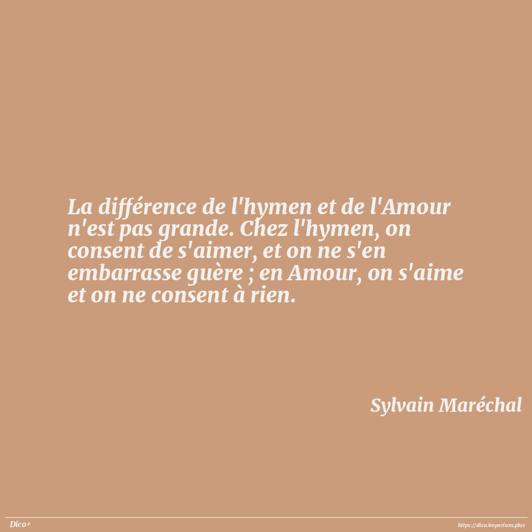 La différence de l'hymen et de l'Amour n'est pas grande. Chez l'hymen, on consent de s'aimer, et on ne s'en embarrasse guère ; en Amour, on s'aime et on ne consent à rien.