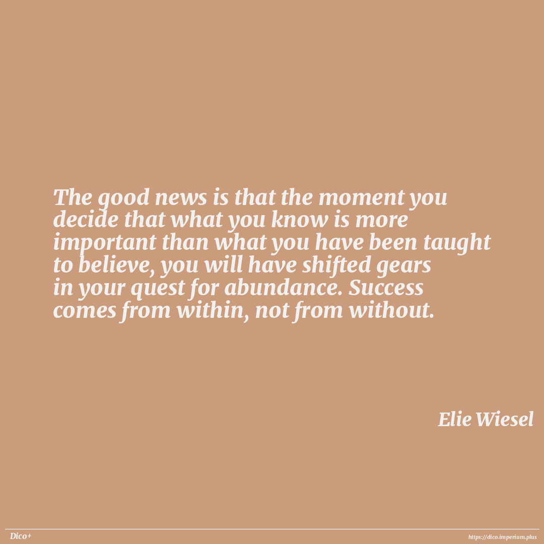 The good news is that the moment you decide that what you know is more important than what you have been taught to believe, you will have shifted gears in your quest for abundance. Success comes from within, not from without.
