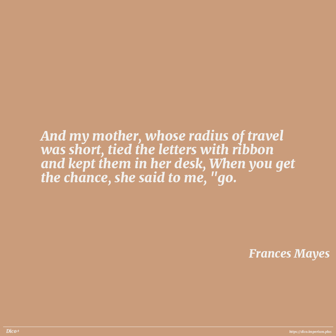 And my mother, whose radius of travel was short, tied the letters with ribbon and kept them in her desk, When you get the chance, she said to me, "go.