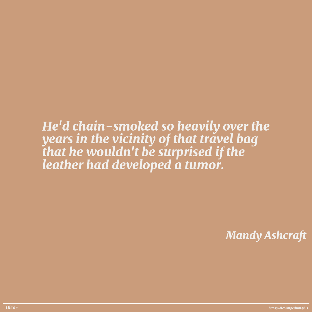 He'd chain-smoked so heavily over the years in the vicinity of that travel bag that he wouldn't be surprised if the leather had developed a tumor.