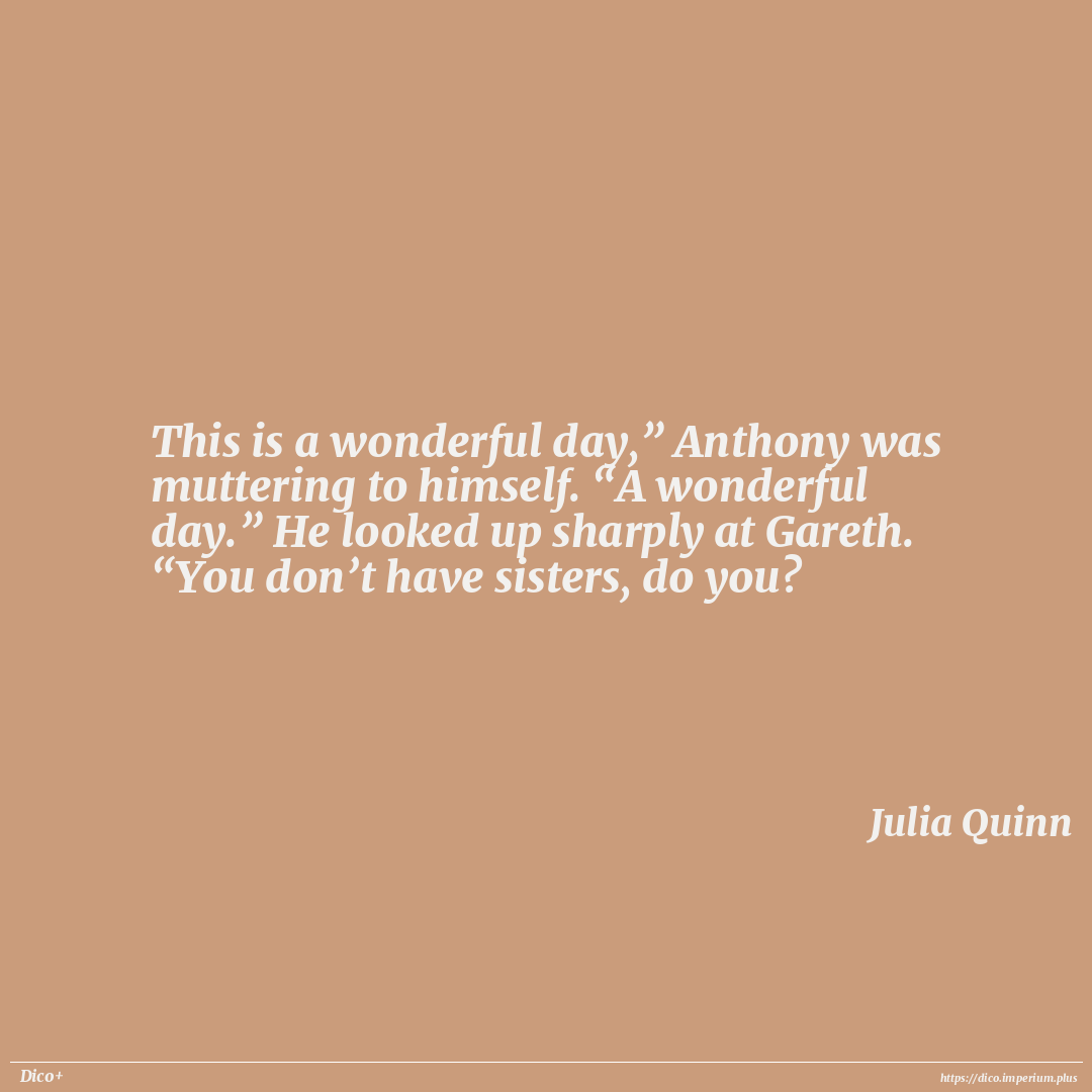 This is a wonderful day,” Anthony was muttering to himself. “A wonderful day.” He looked up sharply at Gareth. “You don’t have sisters, do you?