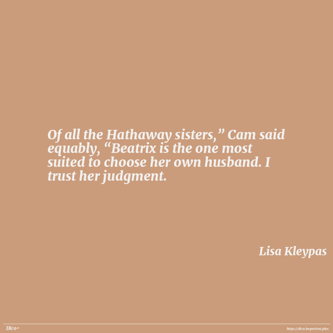 Of all the Hathaway sisters,” Cam said equably, “Beatrix is the one most suited to choose her own husband. I trust her judgment.