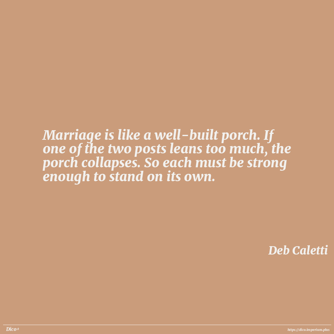 Marriage is like a well-built porch. If one of the two posts leans too much, the porch collapses. So each must be strong enough to stand on its own.
